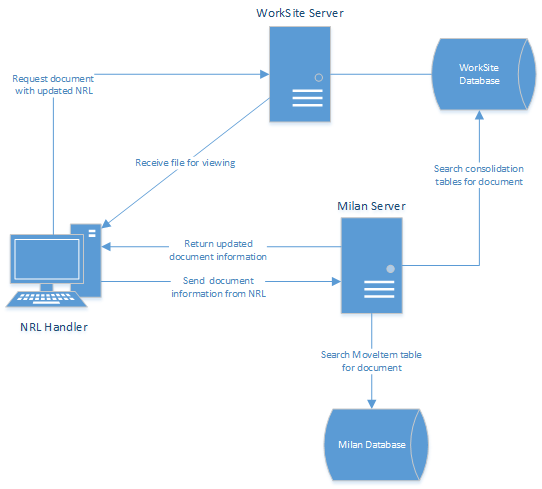 - If a record exists, Milan identifies the new database, docnum, and version for the document, and NRL Handler updates the NRL file; otherwise, the link is used as is.