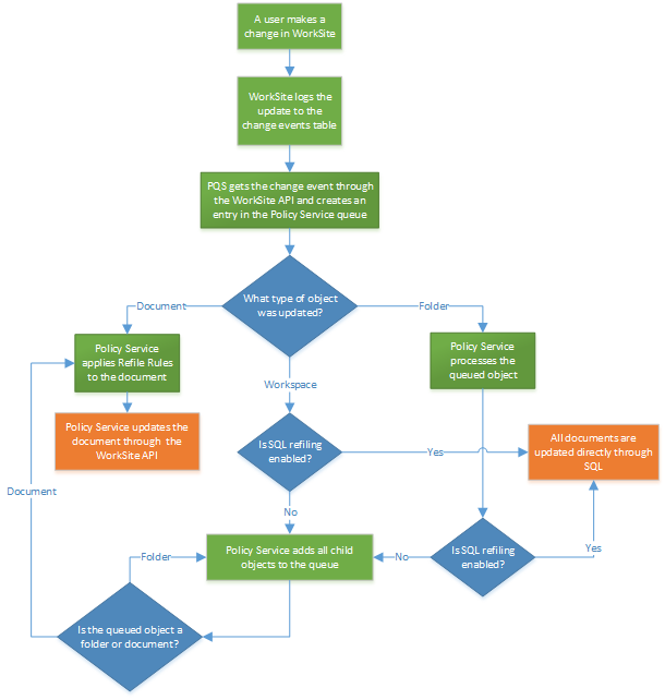 By default, all refiling performed by Milan goes through the WorkSite API. However, changes at the workspace or folder level can be optionally processed by a SQL-based refiling system that is optimized for updating large numbers of child items.