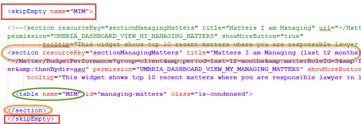 Here you can directly modify the XML for various screens, forms, and workflows within Umbria. Navigate through the folder structure and select a file to populate the XML on the right. You can copy the code from the Original tab and paste it onto the Custom tab, where you can make any desired edits. To discard your changes, click the Revert to Original button. The All Customized Files node will list all the modified XML files. The Frequently Customized Files nodes will list all the XML files frequently modified. Read below on customizing codes. Tip: To hide any of the widgets on the Partner/ Associate Dashboard (if they have no values to display), on the Partner/ Associate Dashboard XML, apply the tags <skipEmpty name = "table name for the section"> & </skip Empty> before and after the sections you want to hide. Note: To hide a property from the e-mail template when the value is empty, add the "hideEmpty=true" attribute. Do not enter any null value format other than "N/A" in the value attribute. To modify and update email notification templates, refer to instructions below. |