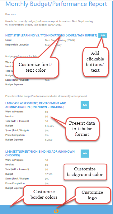 You can build custom email templates with different formats and layouts. Email templates can be edited to include different themes, text links, table grid structures, text highlights, report background and border colors etc. The new templates can also be viewed vertically on your mobile screens and can handle rich text, images, and data. To customize your email template: