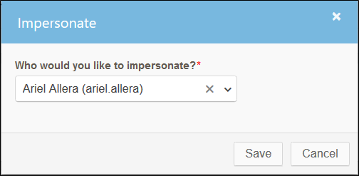 Clicking Impersonate from the user menu opens a pop-up to select the user to impersonate.