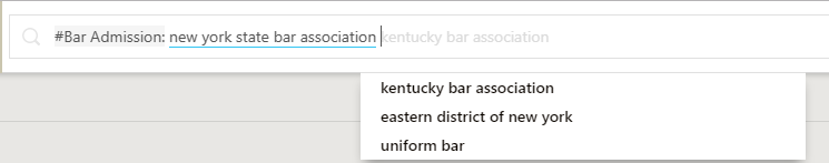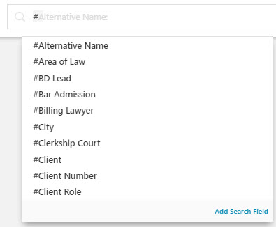 | AND | Use AND to include two search terms. For e.g. #Area of Law: corporate #Billing Lawyer: marcus, alexey AND #Matter Subtype: appeals . The search results will display all corporate matters with Alexey Marcus as the Billing Lawyer and with Matter Subtype Appeals. |