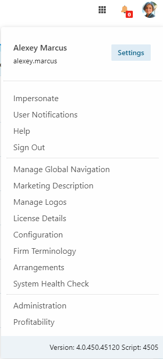 Click the user icon (your profile picture) in the upper right corner of the application to access your User Menu. Options available in the user menu will vary based on your permissions. The bottom of the User Menu screen also shows the Version and Script that correspond with the installed version of Umbria. Reference these numbers when contacting Support. |
