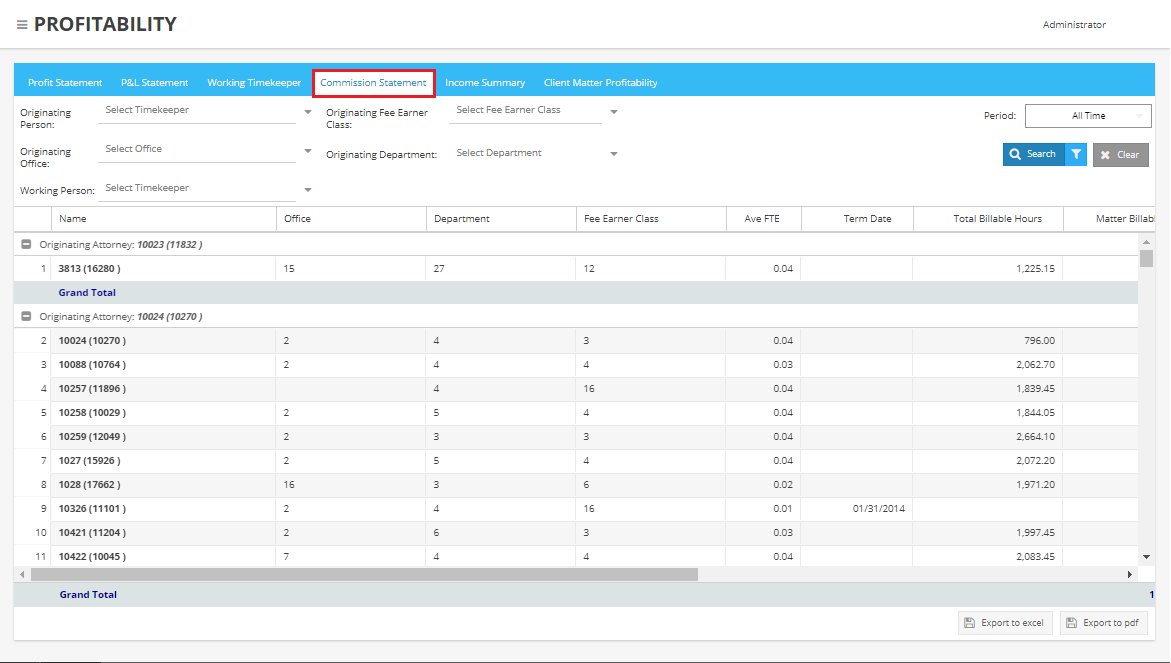 The Commission Statement displays a report by the originating attorney. This report pulls all matters where a selected timekeeper is the originating attorney, then finds all timekeepers who worked on these matters, and then displays the report by timekeepers. This report is produced from the Revenuesummary, Timemonth and HourlyCostMonth tables