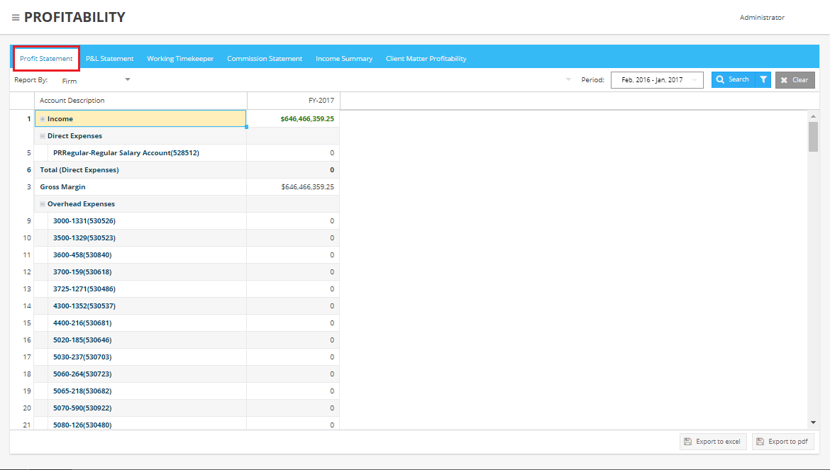 Expand the Income header row to see a separate row for each General Ledger account that accumulated income during the time period and based on the parameters specified. You can click the plus sign to expand a General Ledger account and see a separate row for each affected sub-account. For example, you could expand the row for Collected Revenue to see how much was collected from each individual client. |