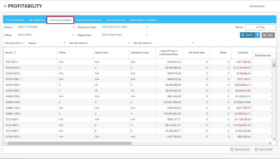 Umbria Profitability comes with built-in reports that allow you to view profitability statistics and easily compare figures for multiple offices, departments, and individual timekeepers. The Reports are accessed on the Profitability module >Reports.
