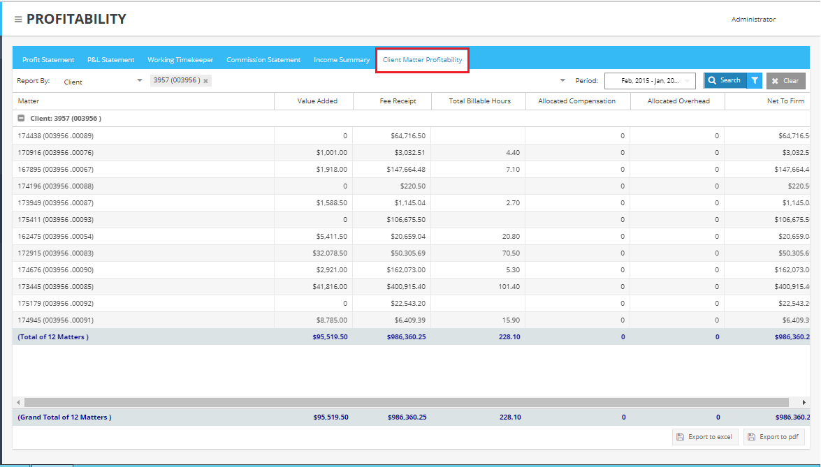 The Client Matter Report displays the profitability by a client and/or matter. For each selected client, all matters for the client are displayed with the following information: