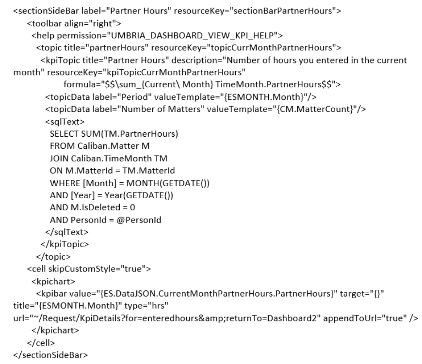 A main feature of Umbria is dashboards with Key Performance Indicators (KPIs). Dashboards display many employee related KPIs. Prior to Umbria 2.1, the list of KPIs were limited to a predetermined set, but now it is possible to introduce new KPIs or tweak the calculation of existing KPIs based on customer requirements. The KPIs in Umbria are created with Extensible Markup Language (XML) code. System Administrators familiar with XML coding can create and modify KPIs within Umbria without the need to contact Prosperoware for implementation.
