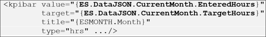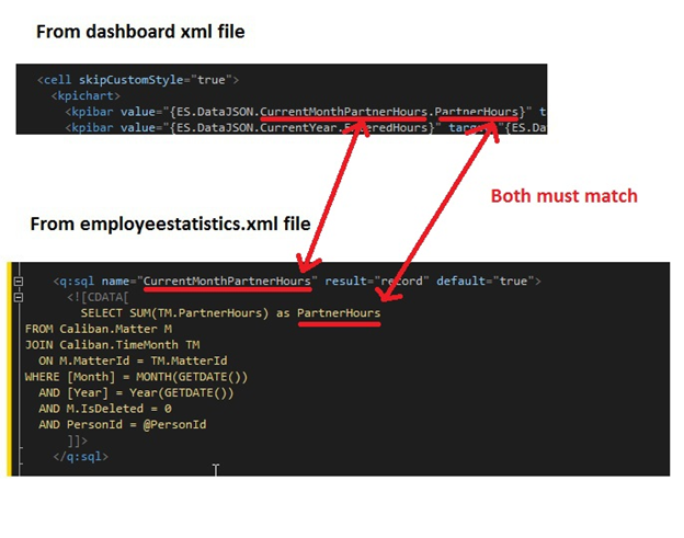 In the cell/kpichart, the value must reference the JSON that we updated in the EmployeeStatistics steps at the beginning. Below is an example of the format, and these two names must match the names in the EmployeeStatistics.xml file.